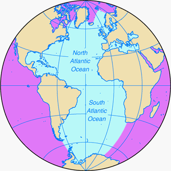 2 olub, 4 yarım kürədə yerləşir. O, qərbdən Amerika, şərqdən Avropa və Afrika, cənubdan Antarktida ilə əhatələnib. Ən enli yeri mülayim enliklərdədir, ekvatora yaxınlaşdıqca daralır.